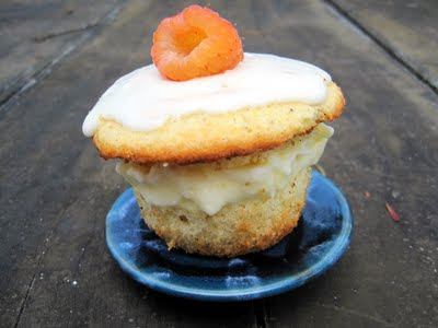 The pineapple sorbet is paired with ginger-vanilla cupcakes. I chose the cake recipe to use up the whipped cream I had waiting in the fridge after nixing my original ice cream recipe, and then added ground vanilla and ground ginger. It's an interesting technique - replacing the butter with whipped cream yields a light, tender, and delicious cupcake. When I first tasted the warm cupcakes, I thought the ginger flavor wasn't strong enough, but after they cooled, I decided it was perfect - not too strong, but definitely there and a great complement to the pineapple sorbet. Everything is topped off with a pineapple glaze and a golden raspberry to make for a delicious ice cream cupcake! Thanks to the Cupcake Project and Scoopalicious for hosting the 2011 Ice Cream Cupcake Contest - creating these cupcakes was so much fun, and I can't wait to see what everyone else comes up with! Be sure to check out their posts if you'd like to enter a cupcake (deadline is June 15).