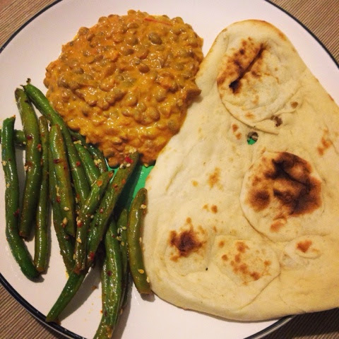 On the side are spicy coconut green beans. Again, you can use less chile if you want a milder dish. I loved the idea of tossing green beans with coconut milk -- it added a subtle coconut flavor that made for a simple and tasty side dish. I don't think they're technically an Indian dish, but they went perfectly with the dal. Don't forget naan or rice as well -- we had Trader Joe's frozen naan, which is quick and really yummy.